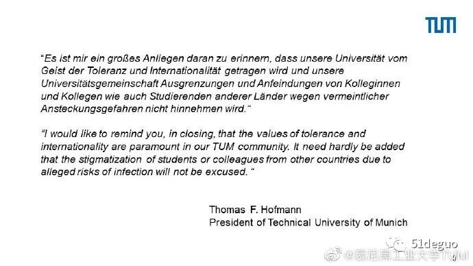 疫情期间,虽然有很多不好的传言,但是更多的是积极的声音。比如,慕尼黑工业大学校长Thomas F. Hofmann教授发出了一封公开信,向全校师生介绍了新冠状病毒疫情目前在德国的发展情况以及需要注意的事项。校长提醒大家,如果出现相关症状请及时致电+49 (0)89-2180 13500寻求帮助。同时也建议从疫区回德国的师生可能的情况下最好能在家中自行隔离14天,以保证自己和身边人的健康。Hofmann校长在信中还郑重强调,“包容和国际化是慕尼黑工大的核心宗旨,我们绝不能因为假定的感染风险而排斥或欺辱来自其他国家的师生 “。希望大家都健康平安,共克难关